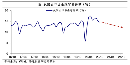 所以往后看,随着疫苗在发达经济体逐步起效,欧美国家的生产有望进一步修复;而对于新兴经济体来说,尽管疫情影响消除的时间大概率晚于发达国家,但其生产多已基本适应疫情,初步完成疫后修复。也因此,今年我国可能将面临较显著的出口份额回落压力。