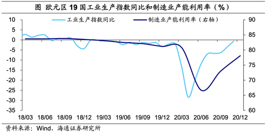 欧元区的工业生产指数同比接近转正,当前增速超过19年平均水平。欧元区工业生产也从5月开始进入修复通道,截至11月,19国工业生产指数同比已回升至-0.6%,创19年4月以来的新高。从产能恢复水平看,四季度欧元区的制造业产能利用率修复至78%,也达到上年同期的九五成以上。