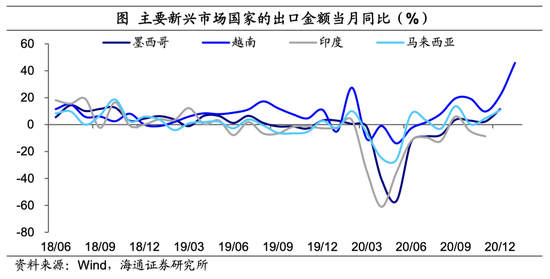 随着生产的相继修复,新兴市场国家的出口也有不同程度的回升。其中越南表现突出,出口金额同比在21年1月飙升至46%,创出2013年以来的新高。墨西哥和马来西亚的同比增速也回升至10%以上,高于2019年的全年水平。