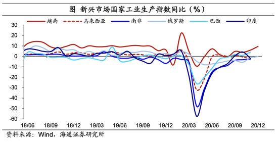 不仅仅是发达经济体,主要的新兴和发展中国家的生产也在不断修复,甚至相比发达国家恢复得更快。比如金砖国家的工业生产指数同比基本都恢复到了疫情前的水平,其中印度、俄罗斯、巴西工业指标均已同比转正。而东南亚生产国,以马来西亚和越南为典型,它们的生产恢复甚至更早,大概在6、7月份就已经回到常态水平。