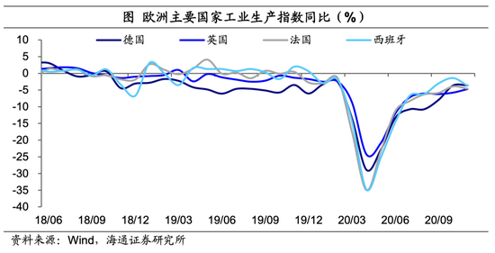 若具体看欧洲的主要国家,虽然德、英、法、西等国的生产指数同比都尚未转正,但均呈现修复的趋势,其中德国同比已恢复到2019年左右水平。整体来看,欧洲地区的生产端同样持续改善,往后看,随着疫苗效果的逐步发挥,生产恢复有望进一步加速。