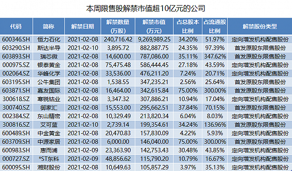 此外,本周限售股解禁数量超过1亿股的上市公司合计有12家,前三分别为恒力石化(600346.SH)、银泰黄金(000975.SZ)、*ST东科(000727.SZ)。