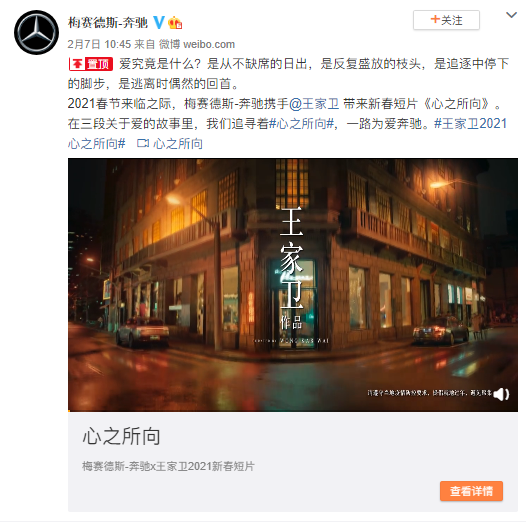 play梅赛德斯-奔驰 王家卫2021新春短片《心之所向》向前向后春节临近,各大车企纷纷发布公司贺岁微电影,2月7日,梅赛德斯奔驰在官方微博@梅赛德斯-奔驰 发布与王家卫导演合作的新春短片《心之所向》。
