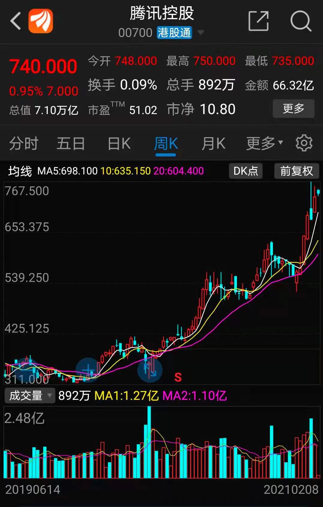 在股市表现方面,从2020年年初至今,腾讯股价涨逾80%,在2021年1月25日更是创下了767.5港元的新高,备受投资者追捧。