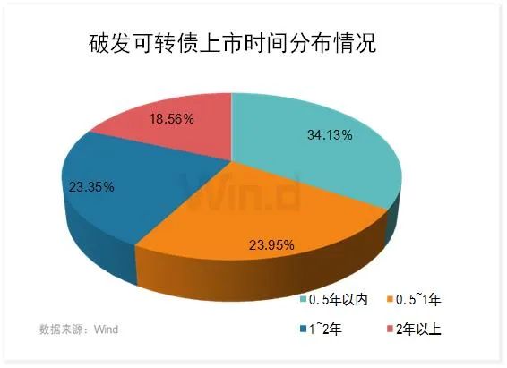 从167只破发的可转债上市时间上看,上市不足半年破发数量最多,达57只,占比最大。此外上市0.5~1年和1~2年间破发的可转债也较多,而上市时间较长,超过2年的目前跌破面值较少。这也意味着新上市的可转债不稳定,更容易破发。