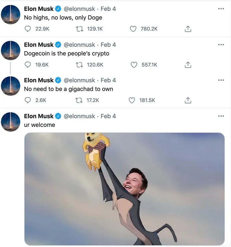 此后,马斯克还在社交平台上为狗狗币“代言”, 狗狗币涨幅迅速攀升50%。