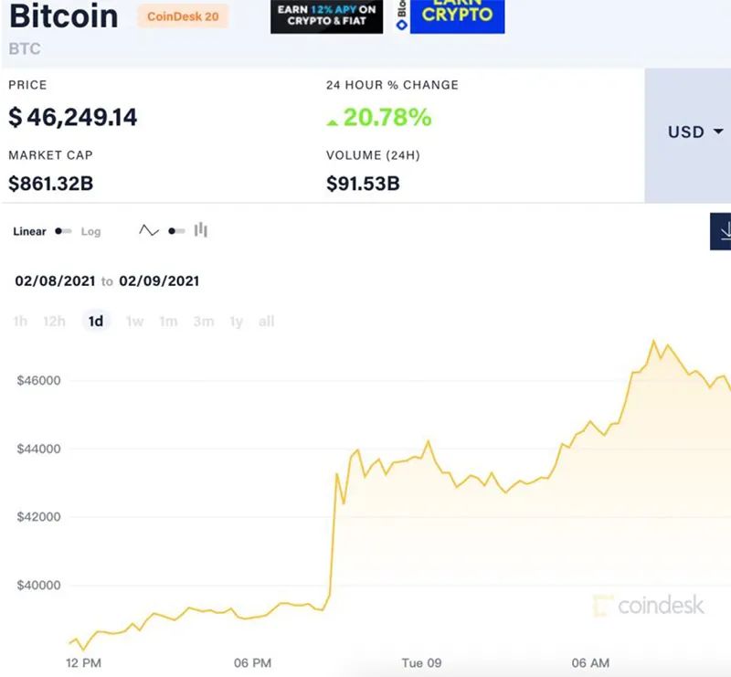 特斯拉购买比特币的消息传出后,比特币价格大幅拉升,目前交易于46000美元上方。