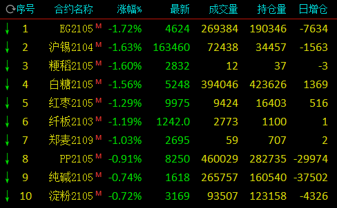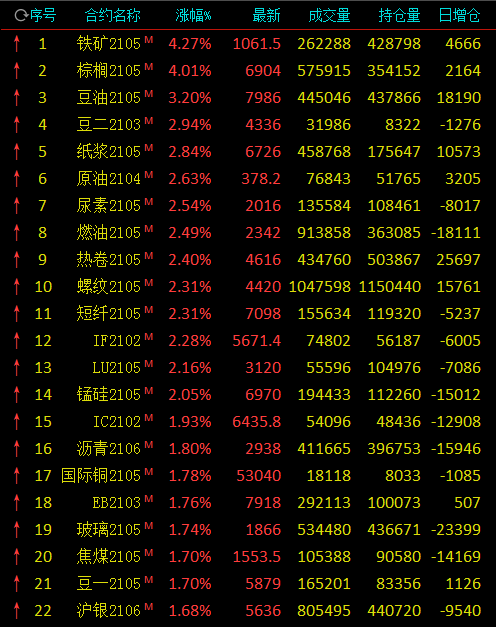 热点栏目2月9日,国内期市大面积收涨,铁矿石、棕榈油涨逾4%,豆油涨逾3%,豆二涨近3%,纸浆、原油、尿素、燃油、热卷、螺纹、短纤涨逾2%;跌幅方面,乙二醇、沪锡跌近2%。
