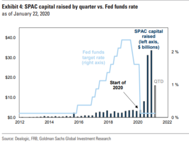 与此同时,当前的低利率环境也助涨了SPAC的繁荣。接近于零的利率,让SPAC对投资者来说机会成本很低。SPAC的发起人在寻找收购公司的阶段,可以在其初始投资中获得最低收益,如果他们不喜欢潜在收购公司,则可以选择赎回其股票(附带应计利息)。