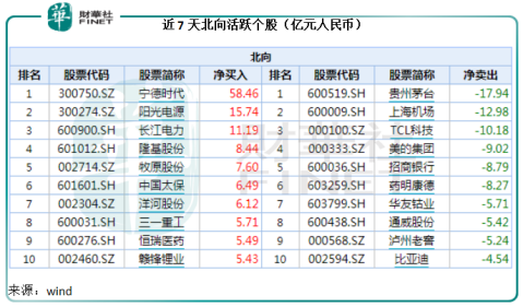 最近七天,宁德时代成为北向资金净买入最多的股票,净买入金额达到58.46亿元,其次为光伏概念的阳光电源(300274-CN)和重要的水电发电企业长江电力(600900-CN),净买入金额分别达到15.74亿元和11.19亿元。