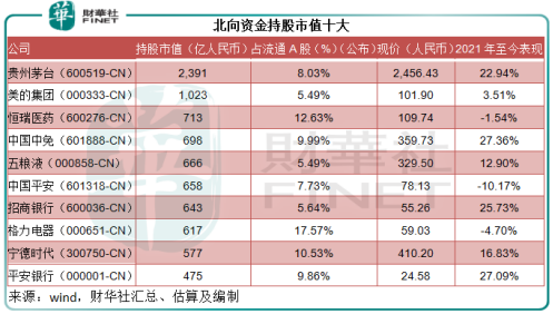 从Wind的数据来看,贵州茅台(600519-CN)仍是北向资金的最爱,持股市值达到2391亿元人民币,占其流通A股的8.03%。其次为美的集团(000333-CN),持股市值也达到1000亿以上,占流通A股的5.49%;市值相当于美的集团一半的竞争对手格力电器(000651-CN),也深受北向资金欢迎,排名第8,持股市值617亿元,占其流通A股的17.57%。