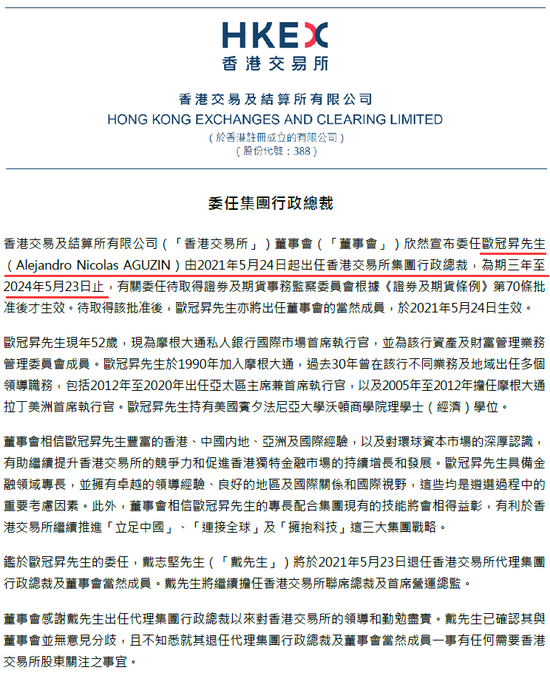 香港交易所,昨日(2月9日)发布公告,正式宣布委任欧冠升(Alejandro Nicolas Aguzin) 由2021年5月24日起出任港交所行政总裁,任期三年。相关委任需取得香港证监会批准后才生效。