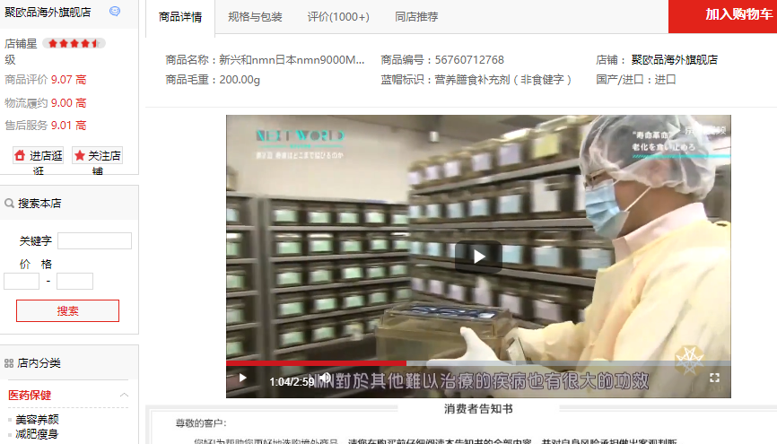 另一家名为“聚欧品海外旗舰店”中销售的“新兴和NMN”中,也通过一个日语视频介绍“NMN对于其他难以治疗的疾病有很大的功效”。
