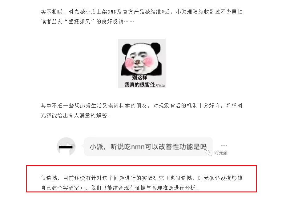 事实上,这样将NMN比作“神药”的宣传比比皆是。1月4日,一个名为“时光派”的微信公众平台发布《独家:探索NMN类长寿药“重振雄风”之谜》一文,其中就提到,NMN“影响睾酮水平,让男人‘重振雄风’”。还在文中直言,“目前还没有针对这个问题进行的实验研究”。该公众号主体为“上海复漾生物科技有限公司”。