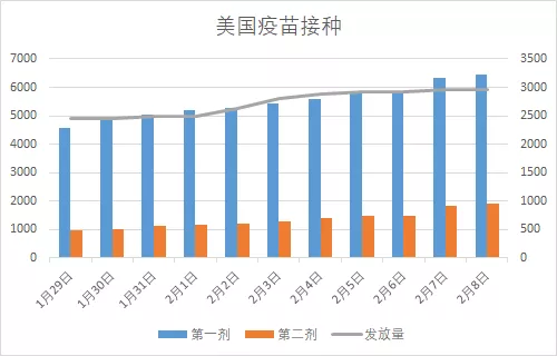 过去十天,美国日均第一剂疫苗接种量是94.9万,日均第二剂疫苗接种量47.3万。按此进度推算,拜登上任百日,可以超额完成接种一亿剂疫苗的目标。