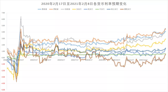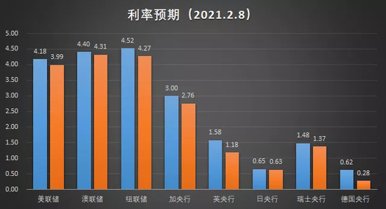 有4个货币的利率预期都高于3倍,但短期都不会有加息动作。一方面是十年期国债收益率的绝对值处于极低水平,尽管持续走高,但仍低于通胀。另一方面是基准利率处于有效利率下边界,即便十债收益率还未回归到正常水平,仍然会放大利率预期的倍数。