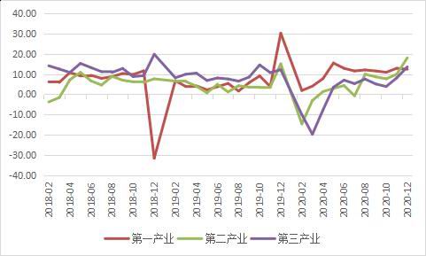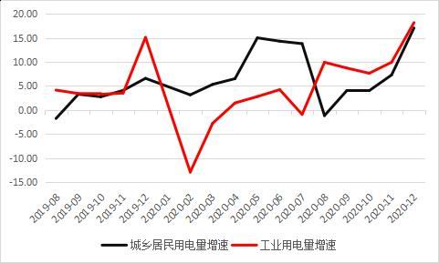 得益于我国疫情防控得当,去年四季度我国对外贸易出口订单超预期增长,进而带动国内工业用电水平高速增长,2020年12月,工业用电当月增速18.16%,其中第一产业同比增长12.41%,第二产业增长18.07%,第三产业增长13.57%。同时受冷冬影响,采暖用电需求激增,12月城乡居民用电同比增长17.06%。