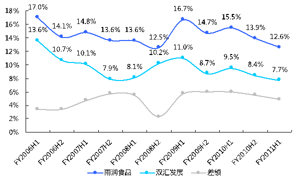 1)公司(大股东)层面:粉饰财务报表推高股价,利于大股东减持套现。我们判断,2005-11年H1公司财务报告有被粉饰甚至造假的嫌疑,手段可能包括降低折旧率抬高利润等,以提高ROE,2002-2010年公司每年ROE都在20%以上,可以说2005-10年漂亮的财务信息是公司股价一路走高的重要推手。2011上半年,在同行业公司双汇营收、扣非归母净利润全面且大幅下滑的情况下,雨润营收、扣非归母净利润实现了89%、72%的增长,业绩远远好于双汇,略显异常。