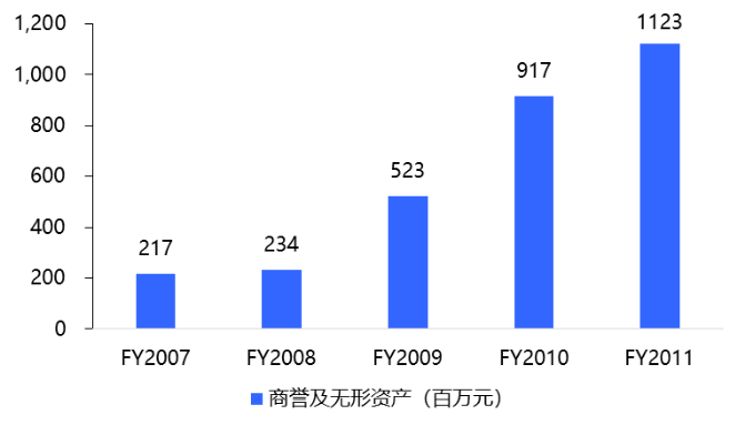 2011年后应收增长放缓,猜测是通过不断的并购形成商誉及无形资产的形式来消化增长的应收。虽然从财务报表看,公司无形资产有较为详细的拆解到收购的标的,以及购置的数量,但其来源和具体实质并不明朗,如下图公司添置和收购了大量的域名、软件、销售网络等,门类众多,如3.5亿元的软件和技术等存在大量可操作空间。