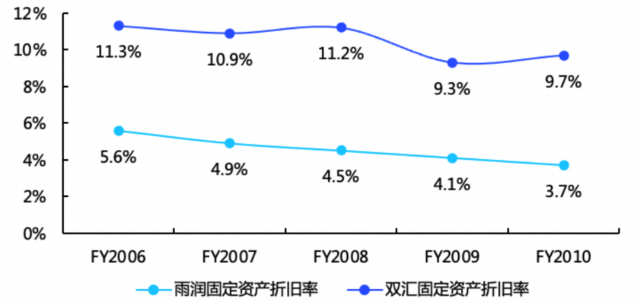 数据来源:雨润年报,国泰君安证券研究。注:折旧率=年度折旧额/(期初固定资产净值+期初固定资产净值)*2,雨润的固定资产为“物业、厂房和设备”的金额。