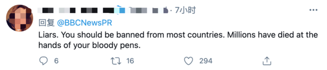 在BBC声明下,最高赞评论说:“骗子!大多数国家都应该禁止你,几百万人死在了你们血腥的笔下。”