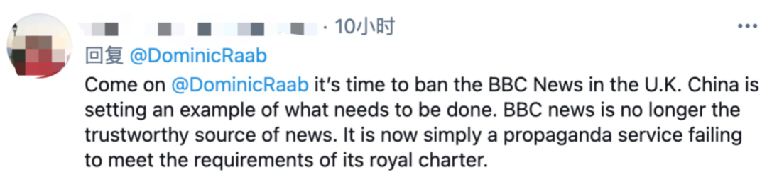 而在多米尼克·拉布的推文下,最高赞评论喊话这位外交大臣:“来吧拉布,是时候在英国禁止BBC新闻了,中国正在树立榜样。BBC不再是新闻的可靠来源,它现在仅仅是一种宣传工具罢了。”