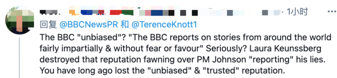 还有人举例驳斥BBC的自我标榜的所谓“公正、不偏不倚地报道世界各地的新闻”,说“你们早就失去了‘公正’和‘可信赖’的声誉”。