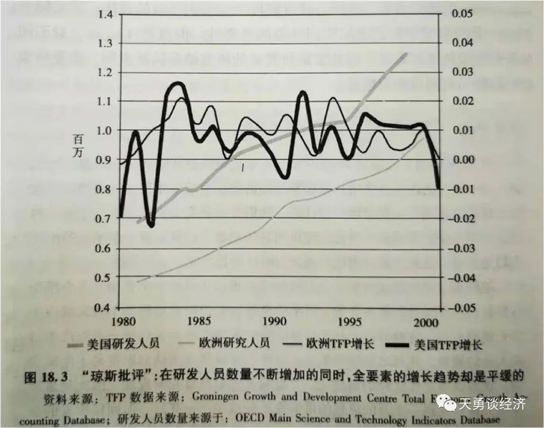 那么,广义技术进步带来FTP增长也会是大幅度倒V或者倒U波动,并且长期趋势是向上倾斜的一条非线性曲线吗?读到的实证文献,也使笔者大吃一惊:它是一条虽有小幅度上下波动,但是长期却是一条平稳和平行的曲线。琼斯(Jones,1995)的实证研究发现,美国和欧洲1980—2000年间,在研发人员不断增加(呈右斜甚至是指数性增长)的同时,全要素生产率的增长却是平缓的。