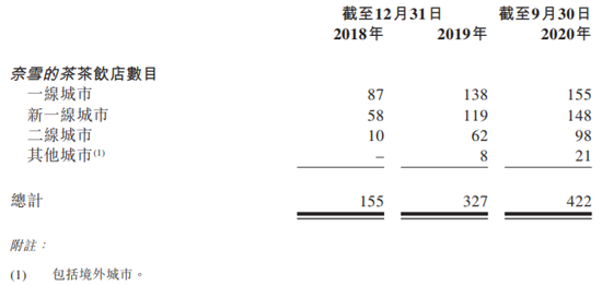 从城市布局来看,一线及新一线城市是奈雪的茶的主要阵地。截至2020年9月30日,其全国的422家门店中有155家覆盖在一线城市,148家覆盖在新一线城市,在二线城市有98家门店。