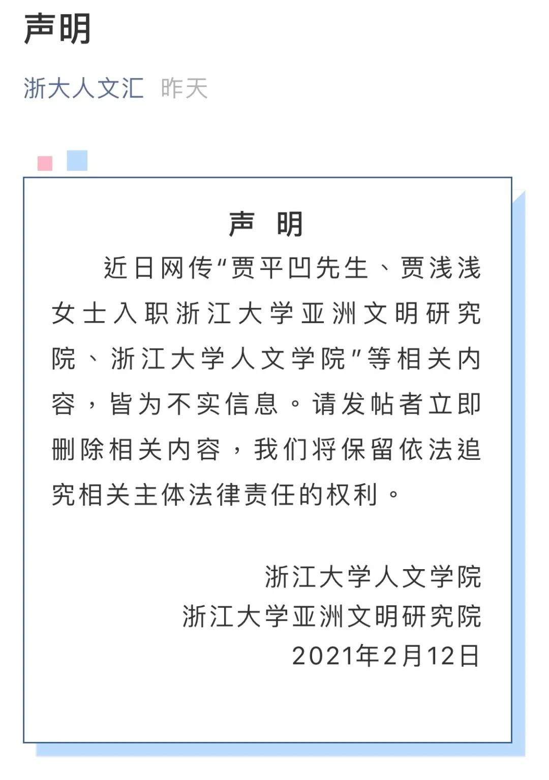 2月12日,浙江大学人文学院、浙江大学亚洲文明研究院发布相关辟谣《声明》:近日网传“贾平凹先生、贾浅浅女士入职浙江大学亚洲文明研究院、浙江大学人文学院”等相关内容,皆为不实信息。请发帖者立即删除相关内容,我们将保留依法追究相关主体法律责任的权利。