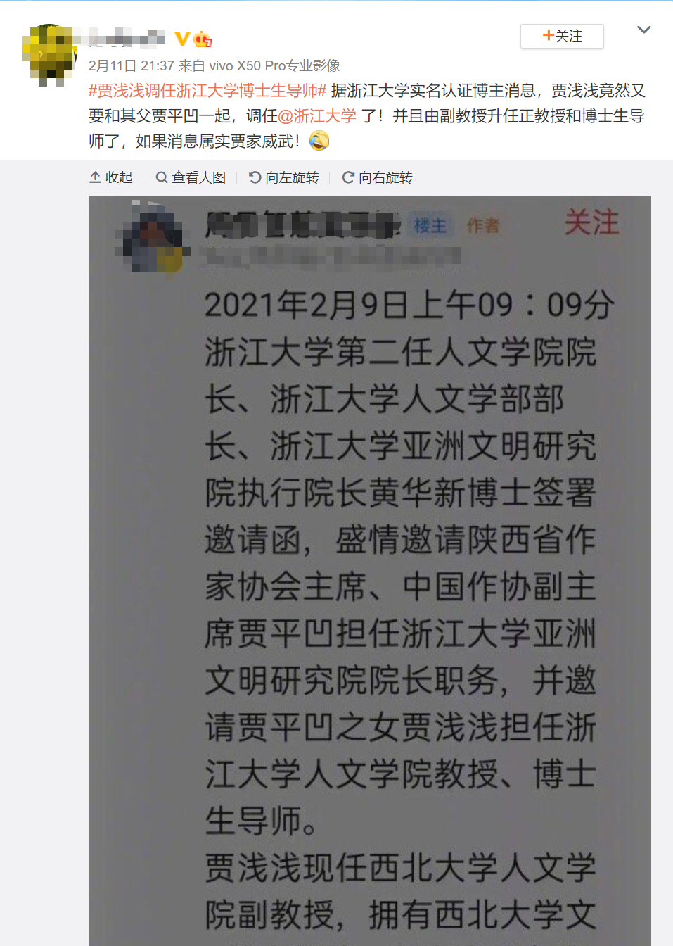 原标题:贾浅浅随贾平凹入职浙大当博导?校方回应
