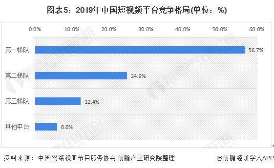 根据前瞻产业研究院分析,网络视听产业短视频平台竞争格局方面,第一梯队市场份额为56.7%,平台分别为抖音和快手;第二梯队市场份额为24.9%,平台有西瓜视频、抖音火山版、好看视频、微视;第三梯队市场份额为12.4%,平台有爱奇艺随刻、波波视频、快手极速版、刷宝、土豆视频、全民小视频、抖音极速版。