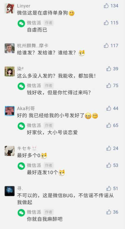 网友评论炸锅:“给谁发?发给谁?谁给发?”“不可以的,这是微信BUG,不信谣不传谣从我做起。”“红包准备好了,能把我老婆的微信号推给我吗?”