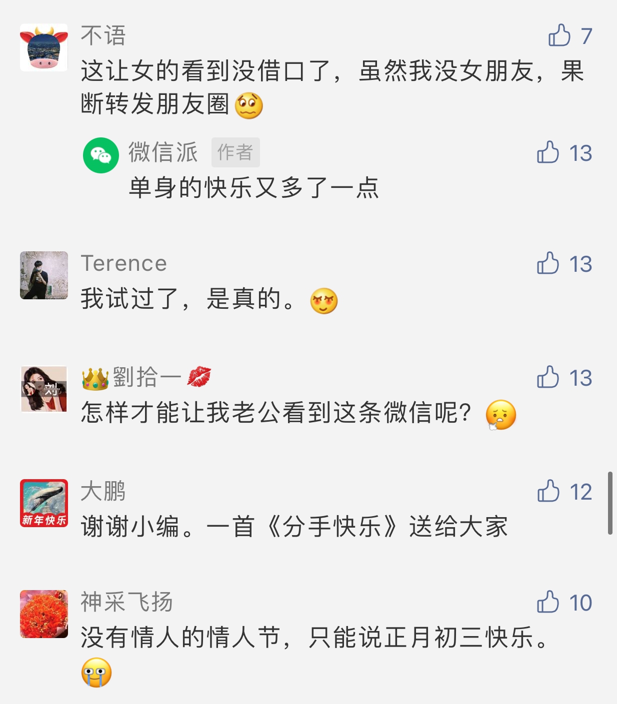 中新经纬客户端2月14日电 (董湘依) 大年初三正好迎来了情人节,2月14日,微信官方号“微信派”发布消息称,“今天,微信又可以发520红包”,并配上了林志颖的一首《为什么受伤的总是我》。讲真,今天你的朋友圈有没有被晒红包、秀恩爱的人士刷屏?