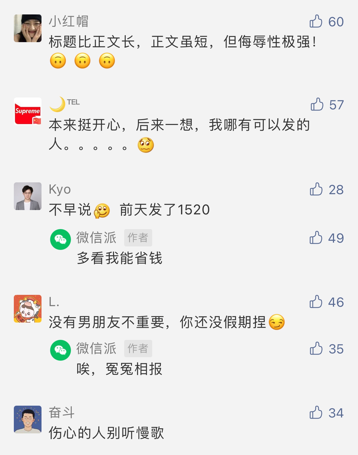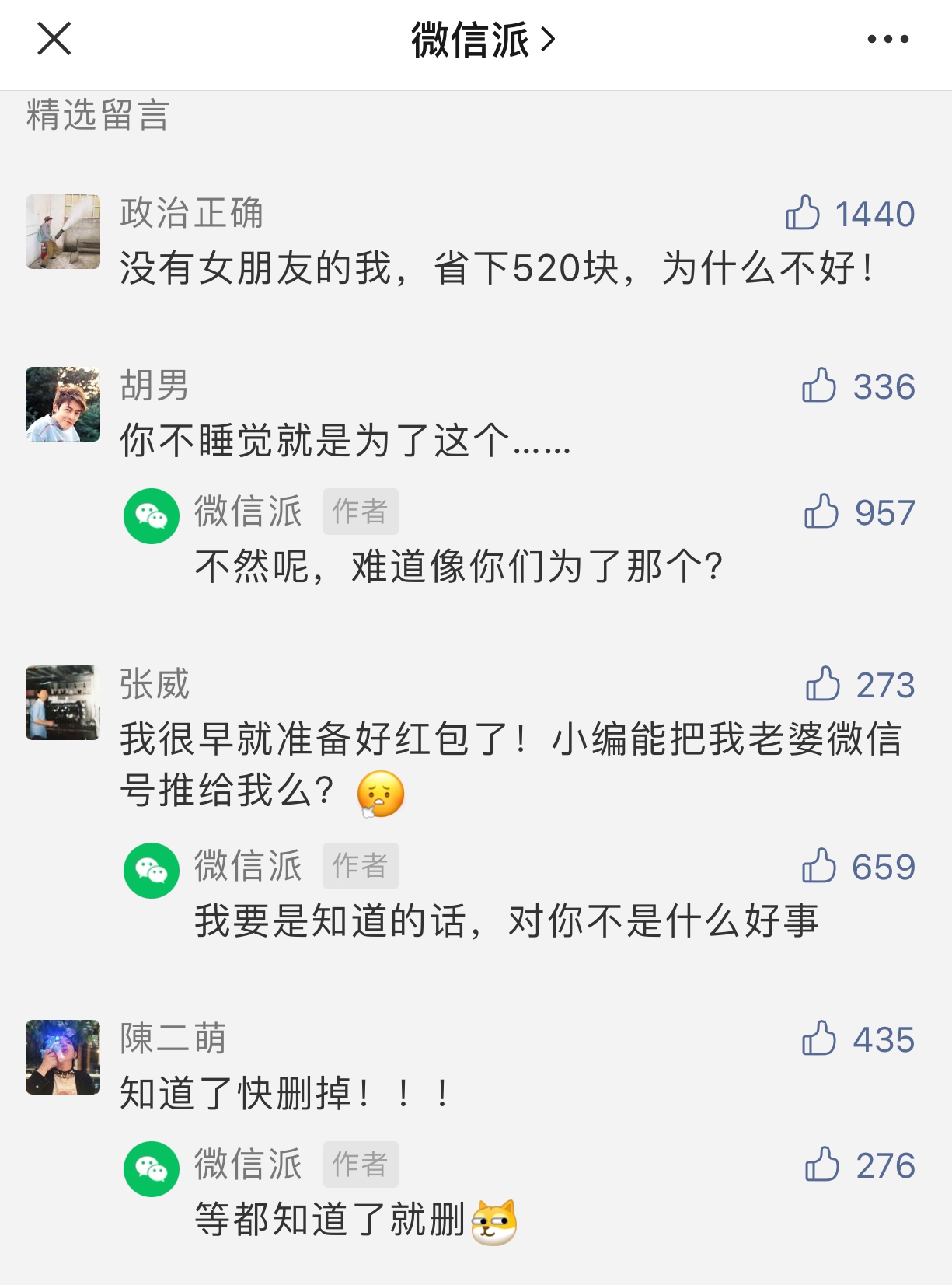 2月14日,微信官方言简意赅地宣布可发“520红包”后,多位网友贡献“神评论”——有网友说,“没有女朋友的我,省下520块,为什么不好!”还有网友发出三连问:“给谁发?发给谁?谁给发?”