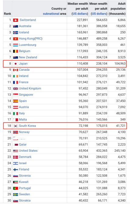 韩国也不差,成年人中位数净财富也超过了7万美元,与意大利、挪威等国相当。