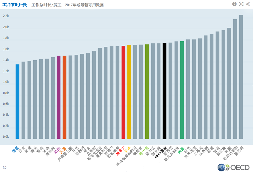 据经济合作发展组织(OECD)数据,38个成员国中,德国职员年工作时间最短,为1356个小时。