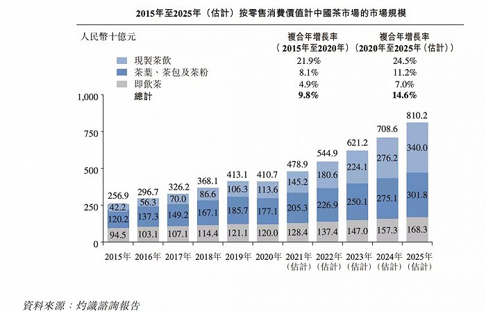 根据该公司引述灼识咨询报告指出,按零售消费价值计,中国现制茶饮于2020年的市场总规模约为人民币1136亿元,预计到2025年将达到3400亿元,复合年增长率为24.5%。