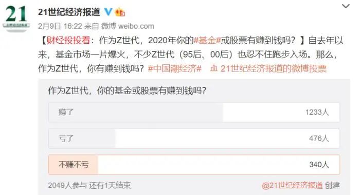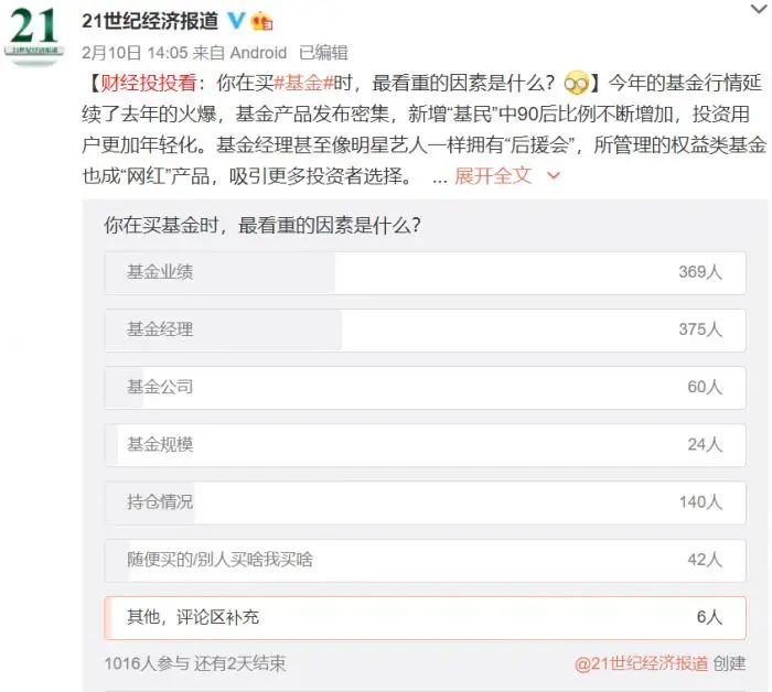 2020年下半年以来,基金话题频频出圈,被戏称“买了包月的热搜”。不少90后跑步进场,还兴起了饭圈式应援基金经理的风气。在21网调实验室多项有关理财的投票调查中,基金都散发着强烈的存在感,拥趸越来越多。可以预见,2021年基金热度仍将延续,基民年轻化趋势愈发明显。