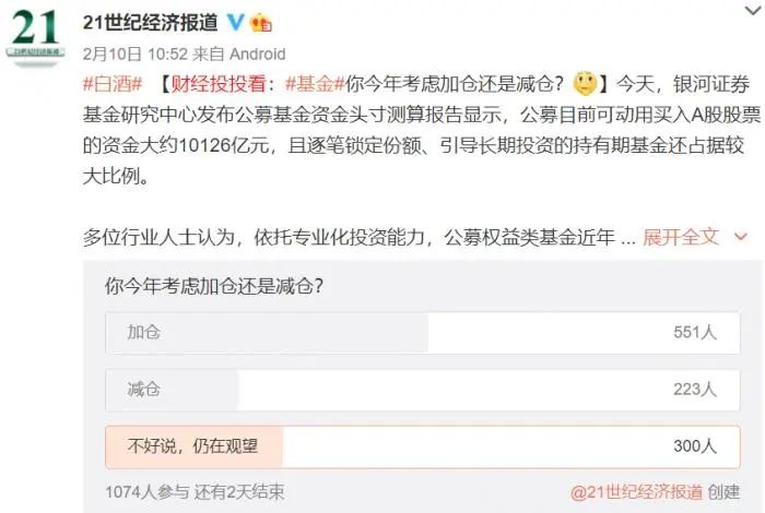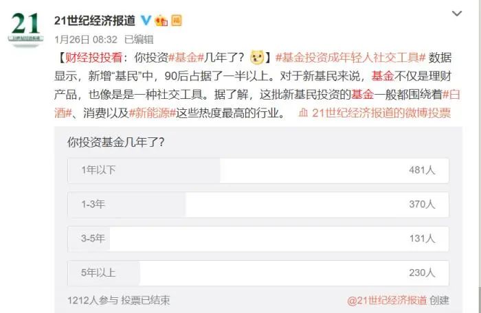 相比之下,基龄5年的小B则冷静许多:“年前涨的有点疯,我总觉得年后情况不太好。可能会看情况适当调仓。”此外,身边还有不少朋友正蠢蠢欲动:“最近有什么好的基金?给推荐下呗。”21网调君不禁思考:全民“养基”时代真的到来了吗?