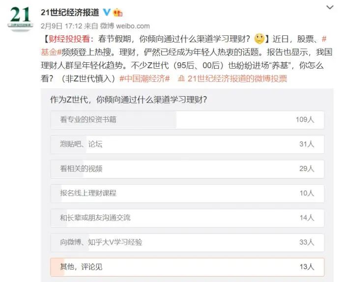 甚至不少Z世代(95后、00后)也加入了养基队伍。投票调查显示,他们主要是通过看专业投资书籍、看微博知乎、跑贴吧论坛、看相关视频等方式来学习理财知识。