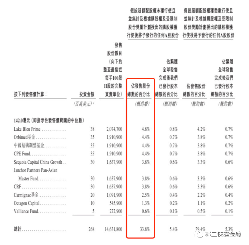 此次IPO 引入11名基石投资者,包括清池资本Lake Bleu Prime、奥博资本Orbimed基金、中国结构调整基金、CPE Fund等,合共认购2.68亿美元(约20.778亿港元)股份,按中间价计算,约占发售股份33.8%,设6个月禁售期。