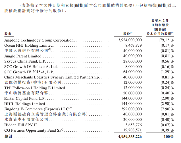 IPO前,京东集团持股79.12%,OceanHHJHoldingLimited持股0.17%,中国人寿信托有限公司持股0.81%;腾讯旗下意像架构投资(香港)有限公司持股为0.24%,TPPFollow-onIHoldingELimited持股为0.24%,千山物流基金有限合伙持股为0.4%,EastarCapitalFundL.P持股为2.9%,高瓴旗下HHJLHoldingsLimited持股为2.9%,JingdongE-Commerce(Express)LLC持股为7.9%,上海沪德越贞企业管理合伙企业(有限合伙)持股为0.81%,永泰资本有限责任公司持股为0.4%。
