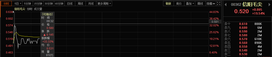 信阳毛尖股价在1港元以下徘徊已久,是名副其实的“仙股”,但于近日微有上涨,昨日收盘前20分钟,信阳毛尖股价拉升6%,今日港股开市一小时内曾冲高至30%涨幅。迎来罕有交易热度。