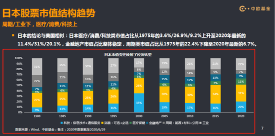 再看近邻日本,可能和我们的社会、人口结构有相似性,结论也类似,医疗、消费、科技类公司的市值占比也是从上世纪70年代到现在稳步提升,其中科技行业目前占20%,消费行业的占比比美国更多一些,占30%。两个行业加起来,比例达到了50%。这是两个比较成熟的股票市场带给我们的一些启示。