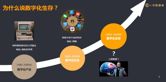 从科技投资的角度展望,我认为未来将是一个数字化生存的时代。为什么这么说?先来回顾过去三、四十年科技行业的发展历程。