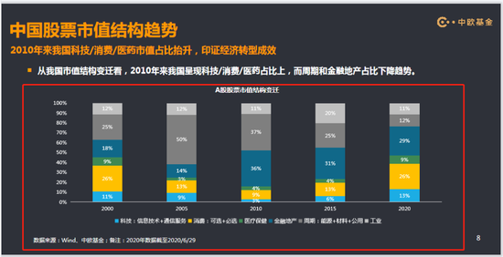 最后看中国市场,消费行业在整个市场占到了接近30%的比例,和金融地产的比例较接近。国内的科技行业发展时间并不长,科技股整体市值不大,市场比例是10%-20%。