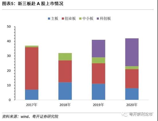 新三板赴A上市方面,2020年共有42家新三板企业选择A股上市,总体规模与去年持平,但在板块选择上,科创板一举超越创业板,成为新三板企业最热衷的方向,共有19家新三板企业成功登陆科创板,占比达45%。
