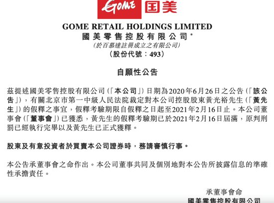 *ST美讯、中关村称,公司获悉,黄光裕的假释考验期已于2021年2月16日届满,原判刑罚已经执行完毕且已正式获释。公司感谢社会各界长期以来对公司发展的关注和支持。