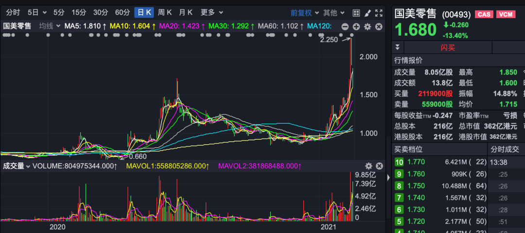 2021年1月起,国美零售大幅上涨,2月16日更是大涨33.93%,不过,2月17日、18日则大幅回落。